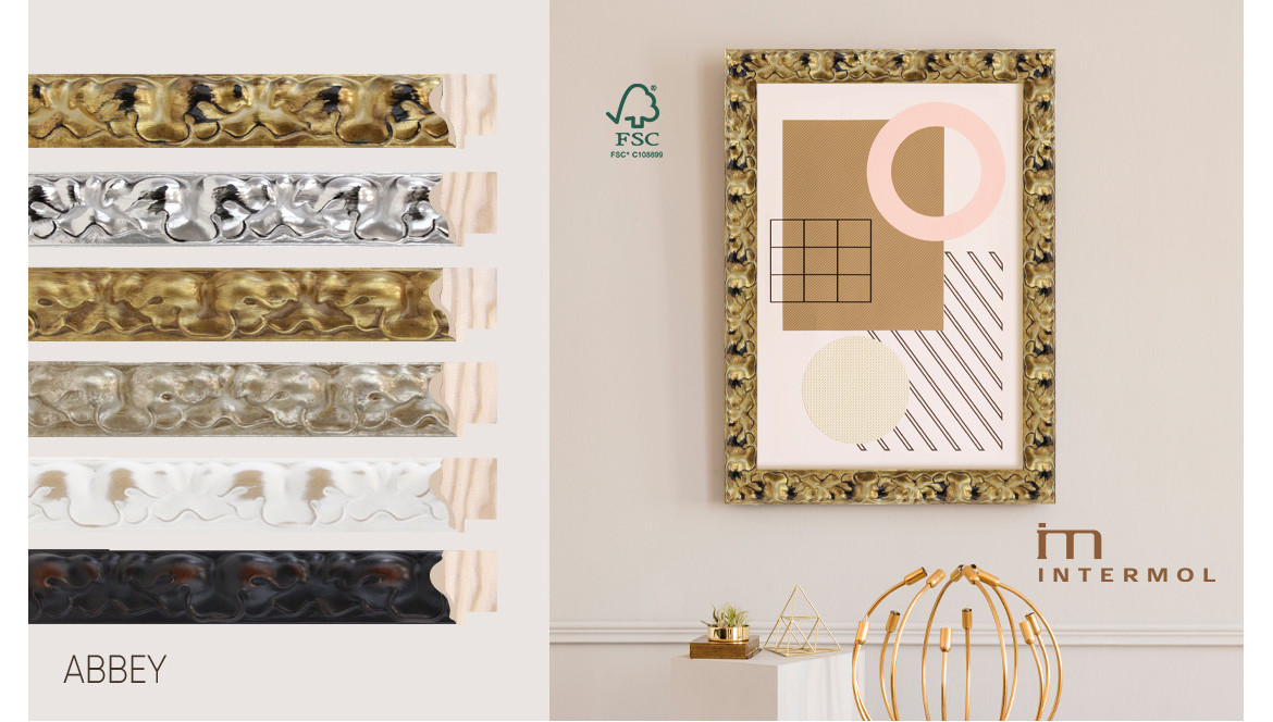 Nueva colección de molduras para cuadros grabadas Abbey disponible en 1 perfil y 6 decorados.