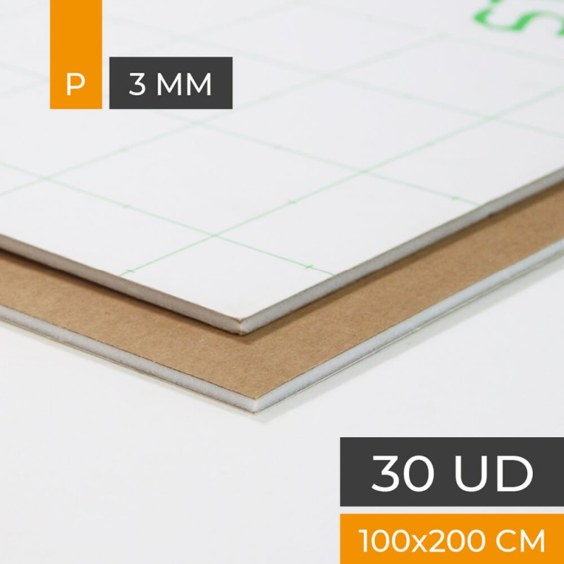 Schaumstoffplatte höchster Qualität mit einer Seite aus braunem Kraftpapier und der anderen Seite mit Klebstoff.Weißer Polystyrolkern.3mmder Dicke.Plattengröße 100x200 cm.Schachtel mit 30 Tellern.
