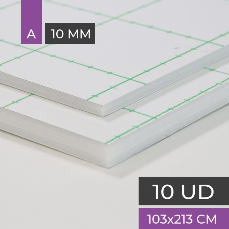 Schaumstoffplatte mit einer doppelten Aluminiumschicht, einer Seite aus mattweißem Papier und einer Seite mit Klebstoff.Weißer Polystyrolkern.10mm.der Dicke.Plattengröße 102x213 cm.Schachtel mit 10 Tellern.