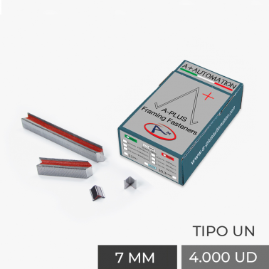 9971607MW A-PLUS STAPLE TYPE 10.3 (UNI) 7 mm SOFT WOOD (BOX 4,000 u) Width: 11mm Height: 7mm Collection COMPLEMENTOS Universal staples 10.3 mm wide and 7 mm high for soft wood. Box of 4,000 units.