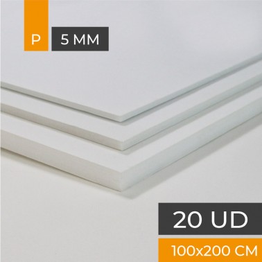 Foam board with matt white paper on both sides. white polystyrene core. 5 mm. thick. Size: 100x200 cm. box 20 sheets.