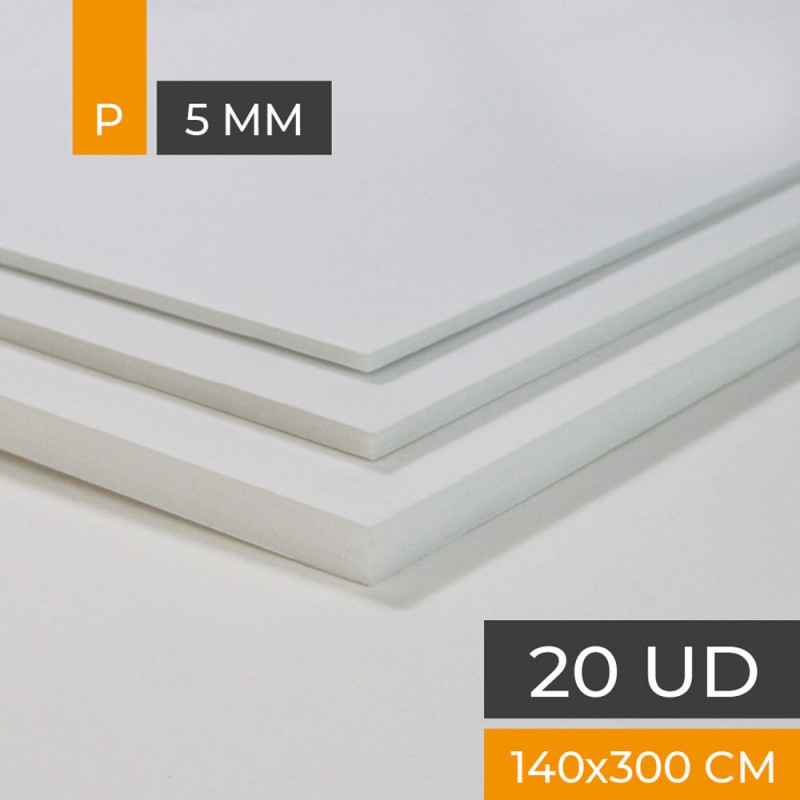 Foam board with matt white paper on both sides. white polystyrene core. 5 mm. thick. Size: 140x300 cm. box 20 sheets.