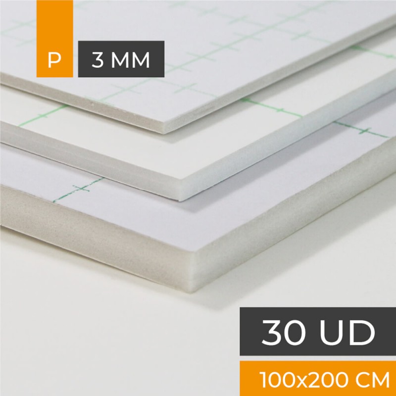 Foam board with a matt white paper face and other adhesive face. white polystyrene core. 3 mm. thick. Size: 100x200 cm. box 30 sheets.