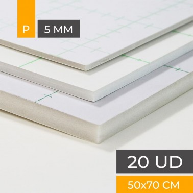 Foam board with matt white paper face and other adhesive face. White polystyrene core. 5 mm. thick. Size: 50x70cm. Box 20 sheets.
