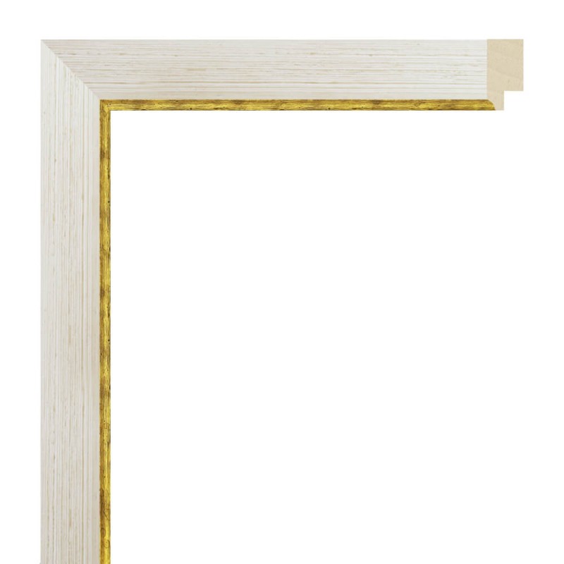 Smooth frame moulding made of ayous wood. Decorated in white patinated and gold edge. Indicated for use as a entrecalle, arpillera or marialuisa. also Suitable to frame combined with other mouldings.