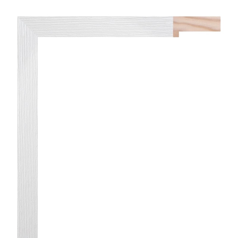 Smooth frame moulding made of finger-joint pine wood. Decorated in white with wood texture imitation film. Moulding with deep rebate. Suitable for vitrine frames.