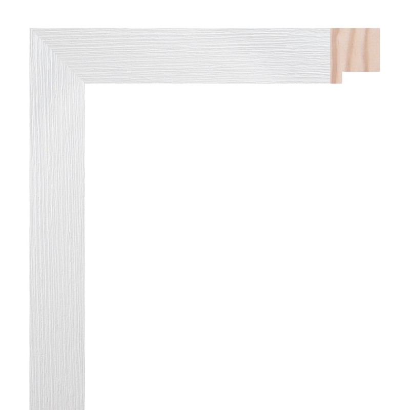 Smooth frame moulding made of finger-joint pine wood. Decorated in white with wood texture imitation film. Suitable for frames of decorative paintings, photographs, illustrations, etc.