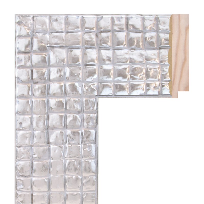 Ornated frame moulding made of finger-joint pine wood. Decorated in cold silver.Indicated for the frame of mirrors and large-format frames.
