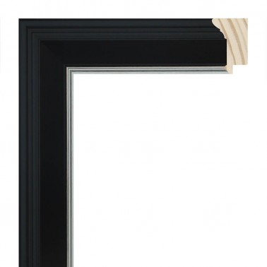 Smooth moulding made of finger-joint pine wood. Decorated lacquered black matt pore enclosed with silver edge. Suitable for frames of decorative paintings, photographs, illustrations, etc.