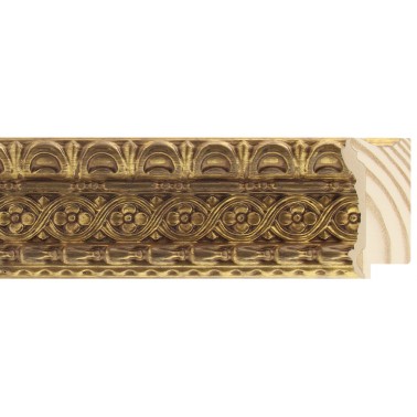 Ornated moulding made of finger-joint pine wood. Decorated in aged gold color. Suitable for decorative frames, photographs, illustrations, etc.
