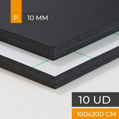 Cartón pluma de máxima calidad con una cara de papel negro mate y otra cara adhesiva. Núcleo de poliestireno negro. 10 mm. de espesor. Tamaño de plancha 100x200 cm. Caja de 10 planchas.