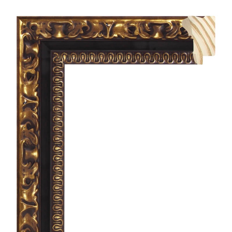 Moldura grabada fabricada en madera de pino finger. Decorado en color oro viejo con entrecalle en nogal oscuro. Adecuada para enmarcaciones de cuadros decorativos, fotografías, ilustraciones, etc.