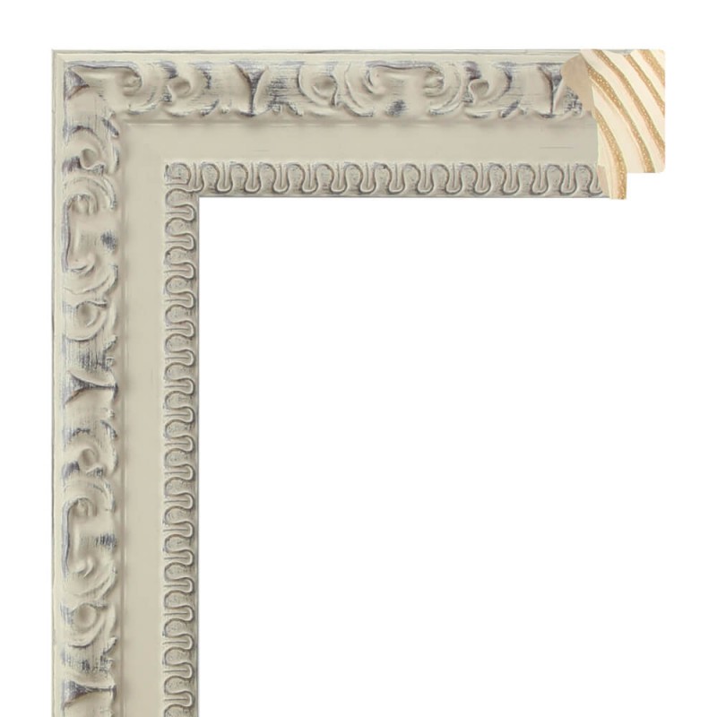 Moldura grabada fabricada en madera de pino finger. Decorado en color crema decapado con el fondo nogal. Adecuada para enmarcaciones de cuadros decorativos, fotografías, ilustraciones, etc.