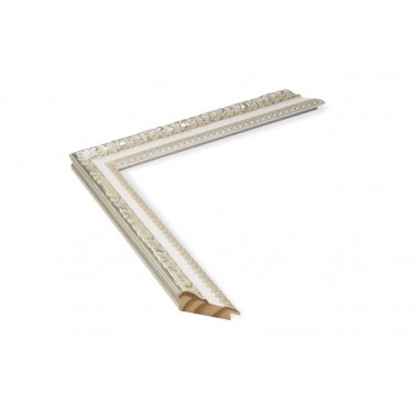 Moldura grabada fabricada en madera de pino finger. Decorado en color plata clara con entrecalle blanca. Adecuada para enmarcaciones de cuadros decorativos, fotografías, ilustraciones, etc.