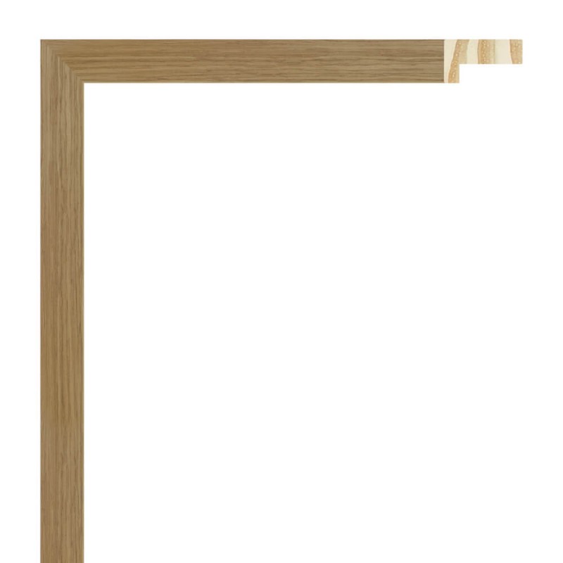 Moldura lisa fabricada en madera de pino finger. Decorado en chapa roble natural. Con galce alto. Indicada para enmarcaciones con cierta separación entre la trasera y el vidrio.
