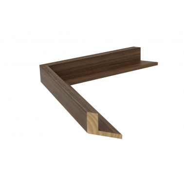 Moldura lisa fabricada en madera de pino finger. Decorado con película imitación nogal con textura de madera. Indicada para uso como caja americana, cajón para lienzos o marco en "L".