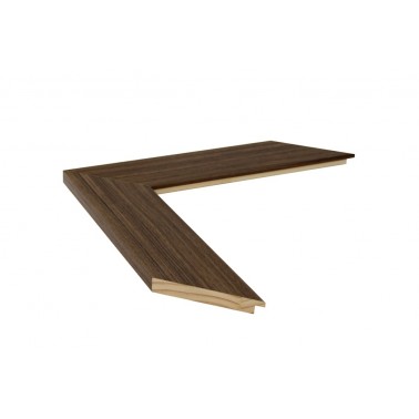 Moldura lisa fabricada en madera de pino finger. Decorado con película imitación nogal con textura de madera. Indicada para la enmarcación de espejos y cuadros de gran formato.