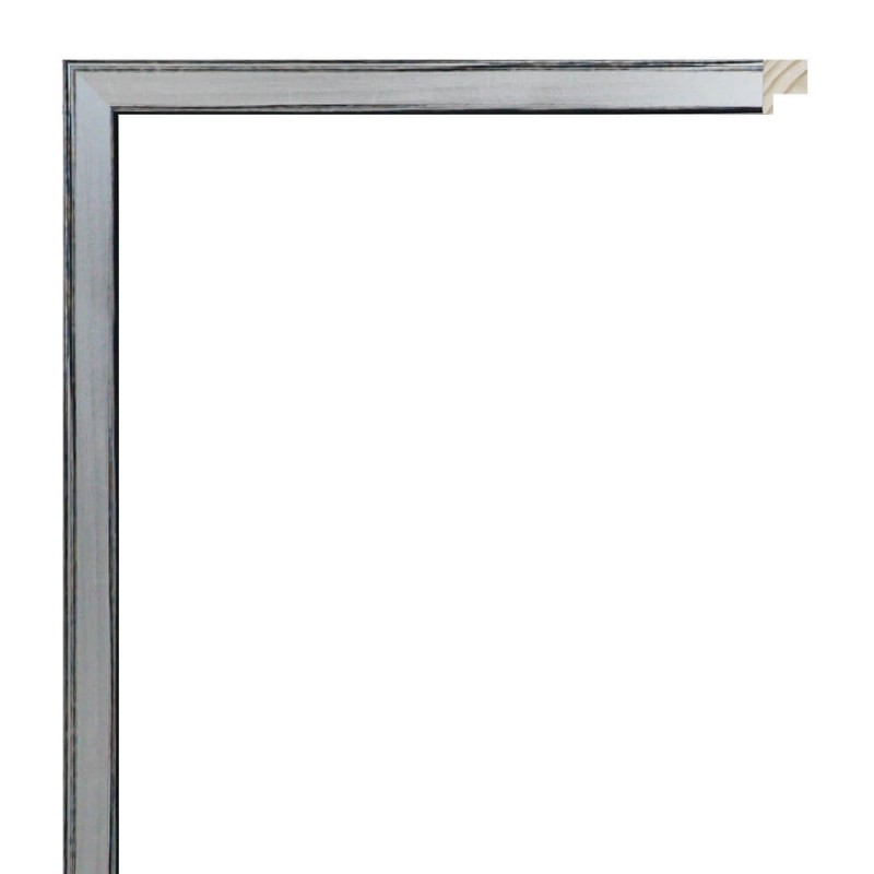 Moldura lisa fabricada en madera de pino finger. Decorado en color plata fría rozada con el fondo en negro. Adecuada para enmarcaciones de cuadros decorativos, fotografías, ilustraciones, etc.