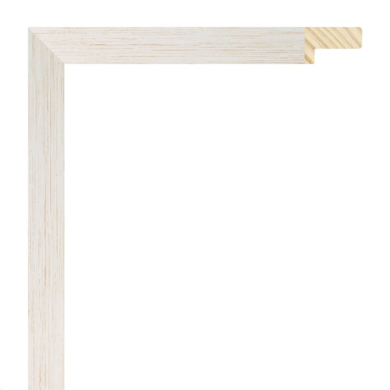 Moldura lisa fabricada en madera de pino finger. Decorado en color blanco lavado texturizado. Con galce alto. Indicada para enmarcaciones con cierta separación entre la trasera y el vidrio.