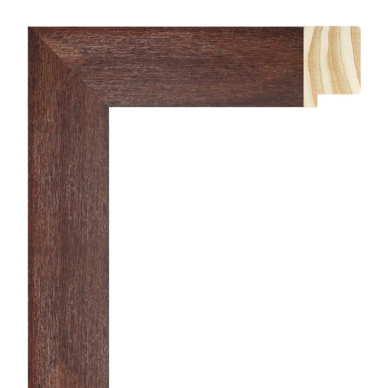 Moldura lisa fabricada en madera de pino finger. Decorado con película imitación nogal con textura madera. Con galce alto. Indicada para enmarcaciones con cierta separación entre la trasera y el vidrio.