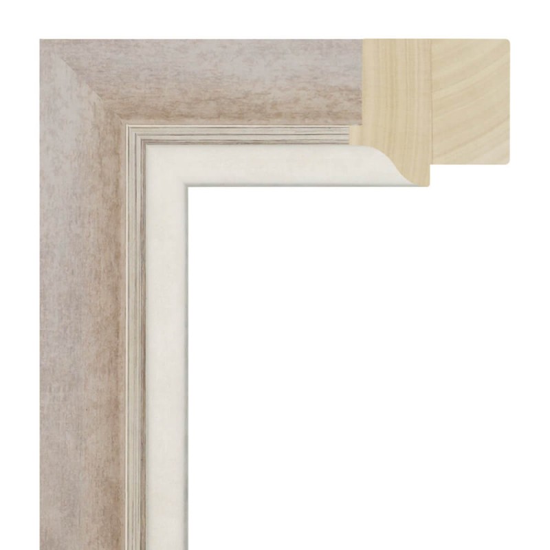 Moldura lisa fabricada en madera de pino finger. Decorado en color gris cemento con el filo en plata. Con galce alto. Indicada para enmarcaciones con cierta separación entre la trasera y el vidrio.