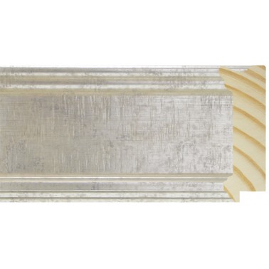 Moldura lisa fabricada en madera de pino finger. Decorado en color plata fría envejecida. Indicada para la enmarcación de espejos y cuadros de gran formato.