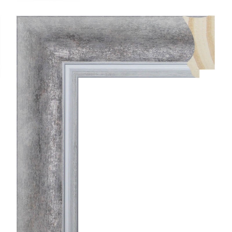 Moldura lisa fabricada en madera de pino finger. Decorado en color gris plateado con el filo en plata. Adecuada para enmarcaciones de cuadros decorativos, fotografías, ilustraciones, etc.