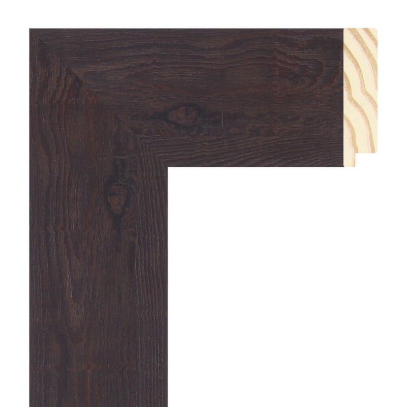 Moldura lisa fabricada en madera de pino finger. Decorado en nogal con pátina oscura. Adecuada para enmarcaciones de cuadros decorativos, fotografías, ilustraciones, etc.