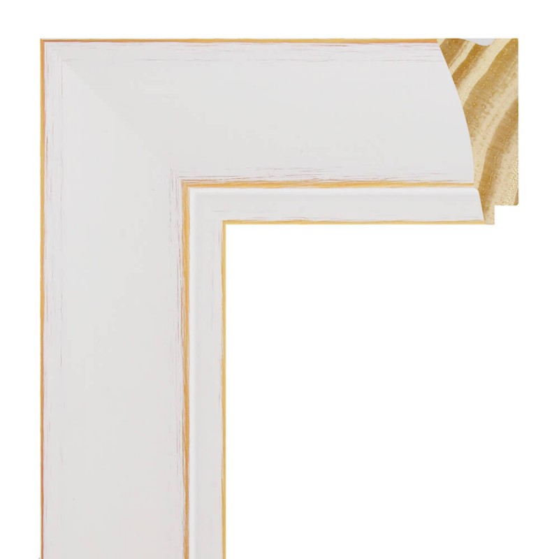 Moldura lisa fabricada en madera de pino finger. Decorado en color blanco mate rozado. Adecuada para enmarcaciones de cuadros decorativos, fotografías, ilustraciones, etc.