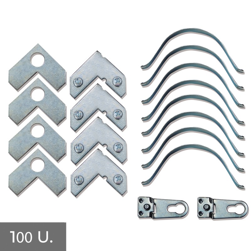 Ensemble de pièces standard pour l'assemblage du cadre en aluminium. Chaque kit est composé de: 4 cadres avec vis, 4 cadres sans vis, 2 racks et 8 sangles. boîte 100 unités.