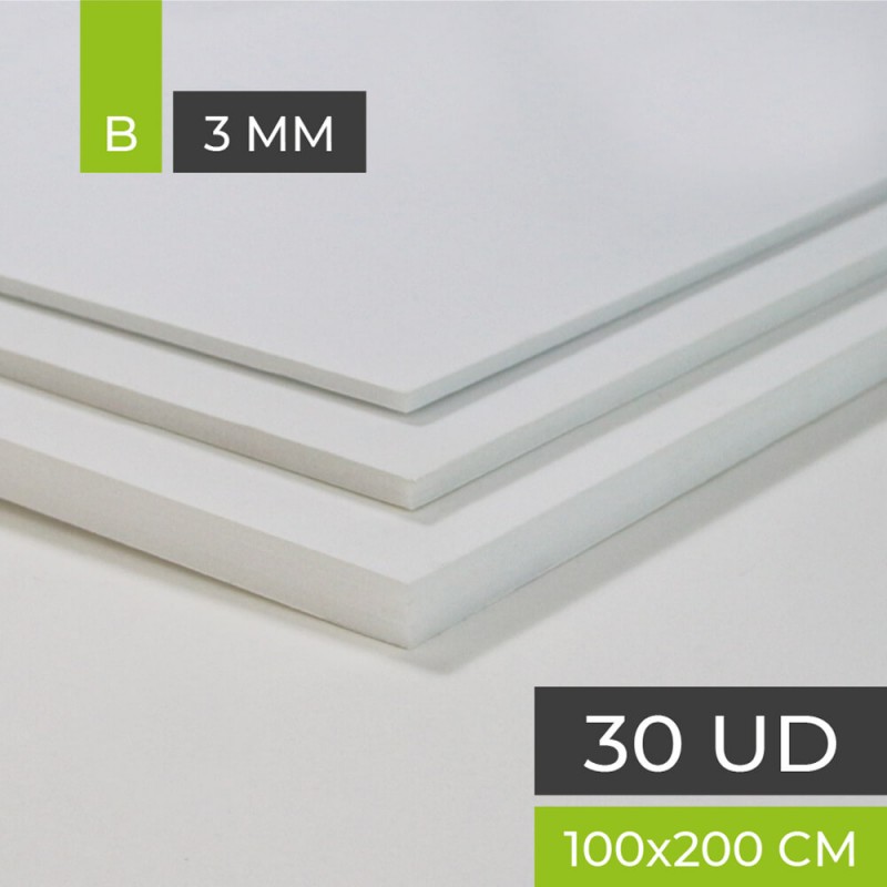 Carton avec papier blanc mat sur les deux côtés. noyau de polystyrène blanc. 3 mm d'épaisseur. fer 70x100 cm. boîte 30 plaques.