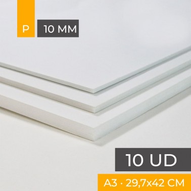 Carton mousse de haute qualité avec papier blanc mat des deux côtés. Noyau en polystyrène blanc. 10 mm d'épaisseur. Taille A3 29,7x42cm. Boîte de 10 feuilles.