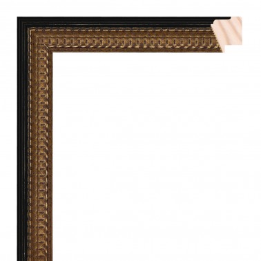 Baguette sculptée en bois de pin finger. Décorée en doré vieilli combiné avec du noir. Adaptée pour l’encadrement de tableaux décoratifs, photographies, illustrations, etc.