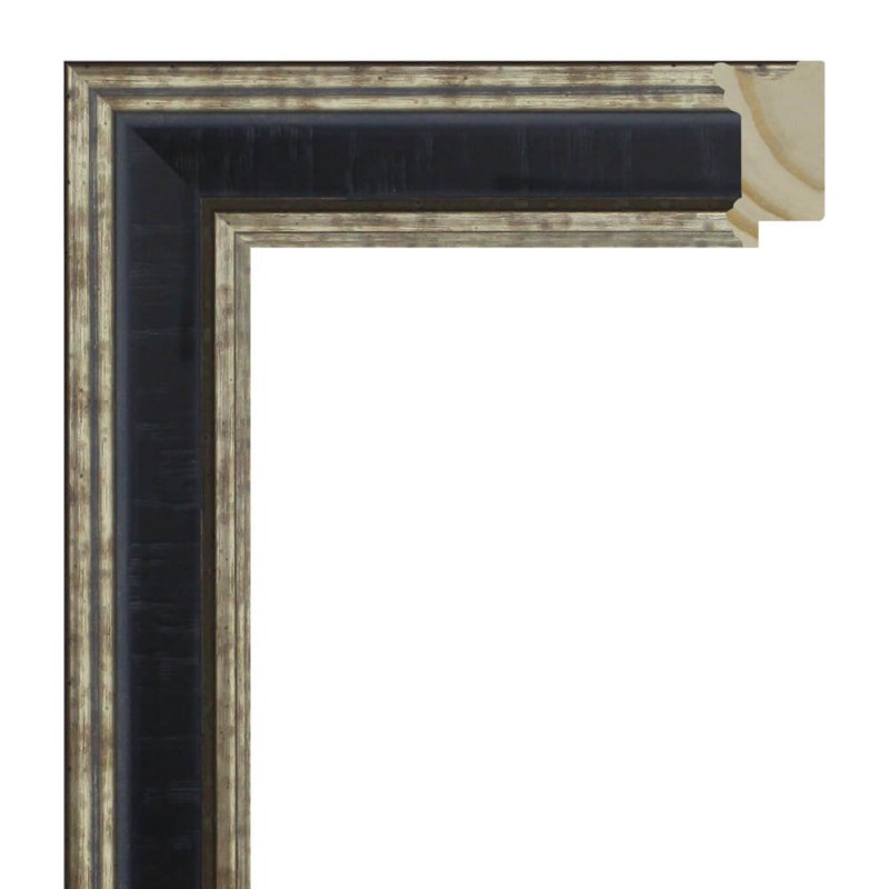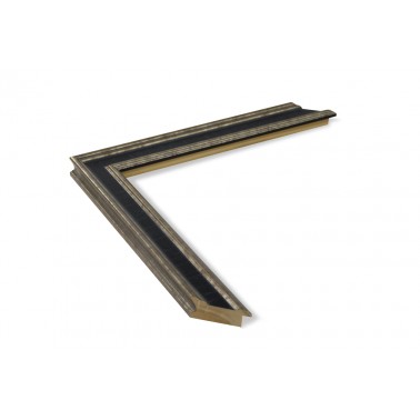Moulure lisse en bois de pin abouté. décoré en couleur argentée avec intercalle noir. adapté aux cadres décoratifs, photographies, illustrations, etc.