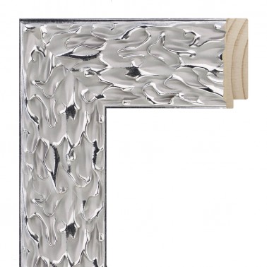 Cornicci inciso in legno di pino finger. Decorato in argento lucido con fondo in argento mate. Indicata per la cornice di specchi e quadri di grande formato.