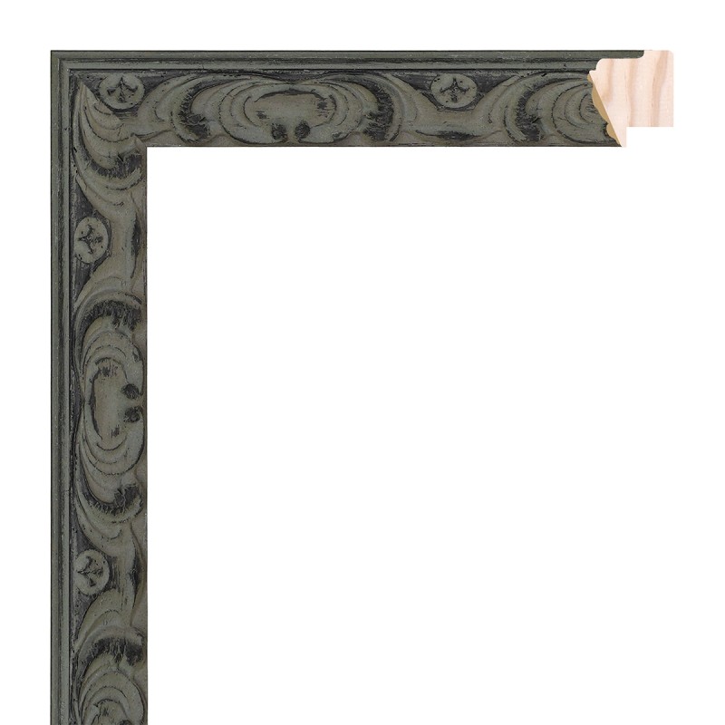Cornice incisa realizzata in legno di pino finger-joint. Finitura grigia invecchiata. Adatta per l’incorniciatura di quadri decorativi, fotografie, illustrazioni, ecc.