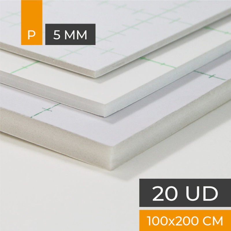 Pannello in schiuma di altissima qualità con un lato di carta bianca opaca e l'altro lato di adesivo. Anima in polistirene bianco. 5mm di spessore. Dimensione piatto 100x200 cm. Scatola da 20 piatti.