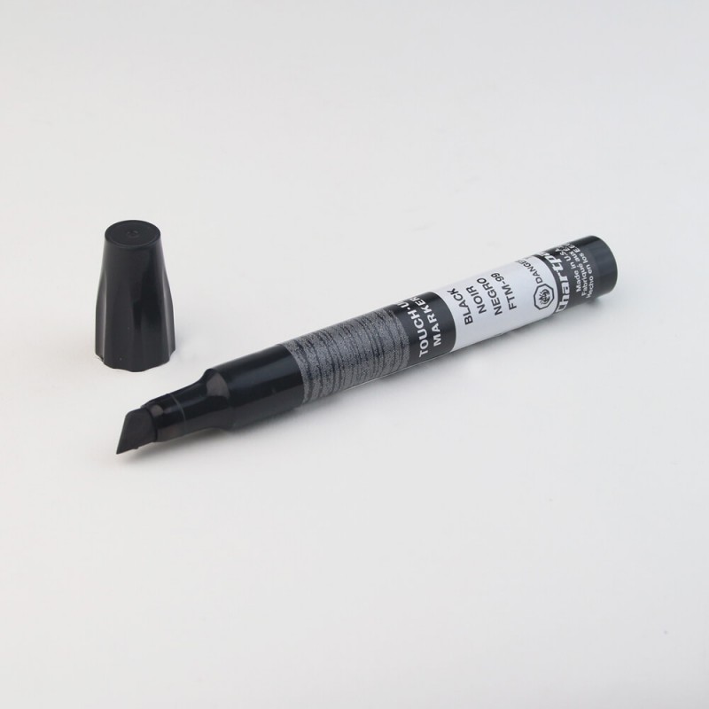 Marcador Chartpak cor preto de ponta chanfrada de traço largo e rápida secagem. Indicado para retoque de molduras de madeira.