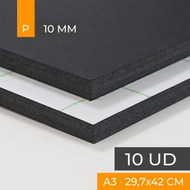 9941791 CARTÃO ESPUMA PLUS PRETO ADESIVO 10mm A3 29,7x42cm Largura: 420mm Altura: 297mm Coleção CARTÓN PLUMA Cartão espuma de alta qualidade com uma cara de papel preto mate e o outra adesiva. Núcleo de poliestireno preto. 10 mm de espessura. Tamanho das...