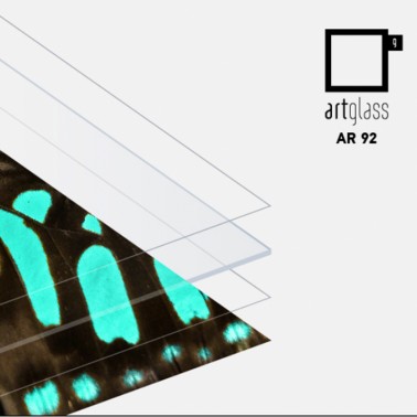Vidro antirreflexos Artglasss extra-claro com proteção UV de 92% e reflexão menos de 1%. Espessura de 2 mm. Em folhas de 120x160 cm. Melhor transmissão de luz: 99%. Fácil de limpar e resistente à abrasão.