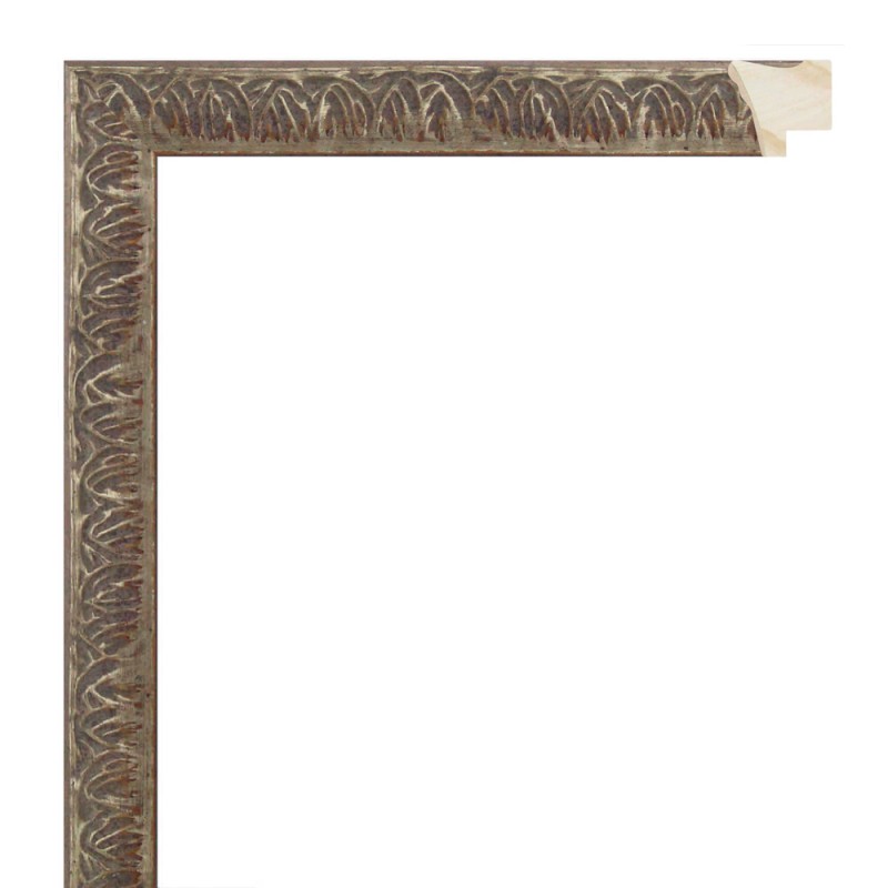 Moldura gravada em madeira de pinho. Decorado em cor prata quente envelhecida. Adequado para emoldurar imagens decorativas, fotografias, ilustrações, etc.