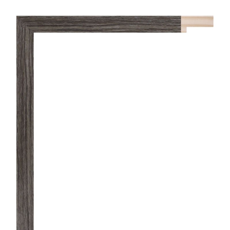 Moldura lisa feita de madeira de pinho. Decorado em cor cinza antracita com uma folha imitação de textura de madeira. Rebaixo alto. Adequado para emoldurar com alguma separação entre a traseira e o vidro.