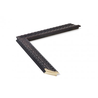 Moldura entalhada fabricada em madeira de ayous. Decorada na cor preta. Indicada para a molduragem de quadros decorativos, fotografias, ilustrações, etc.