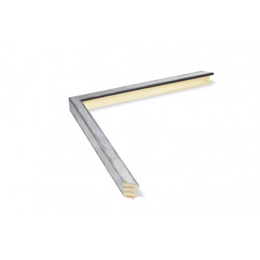 Moldura lisa feita de madeira de pinho. Decorado em cor prata fria escovada com fundo preto. Rebaixo alto. Adequado para emoldurar com alguma separação entre a parte de trás e o vidro.