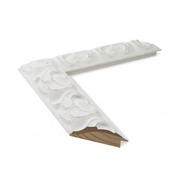 Moldura gravada em madeira de pinho. Decorado em cor branco estucado com acabamento en cor betume. Adequado para emoldurar espelhos e imagens de grande formato.