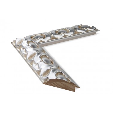 Moldura gravada em madeira de pinho. Decorado em cor prata fria envelhecida com betume. Adequado para emoldurar espelhos e imagens de grande formato.