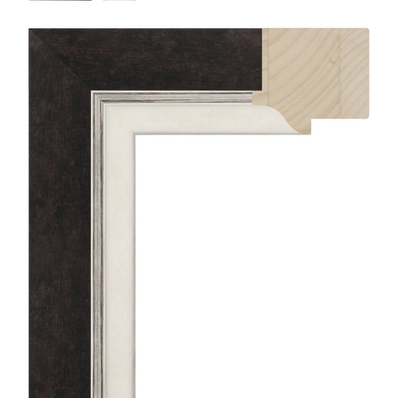 Moldura lisa feita de madeira de pinho. Decorado em preto antracite com bordo prata. Rebaixo alto. Adequado para emoldurar com alguma separação entre a parte de trás e o vidro.