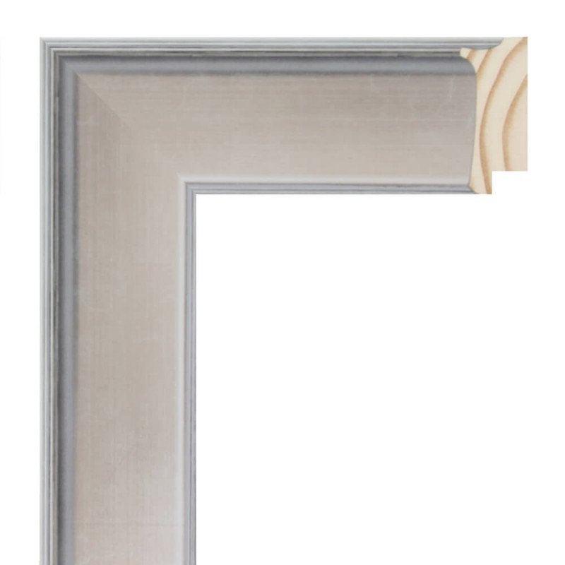 Moldura lisa feita de madeira de pinho. Decorado em prata fria escovada com fundo preto. Adequado para emoldurar imagens decorativas, fotografias, ilustrações, etc.