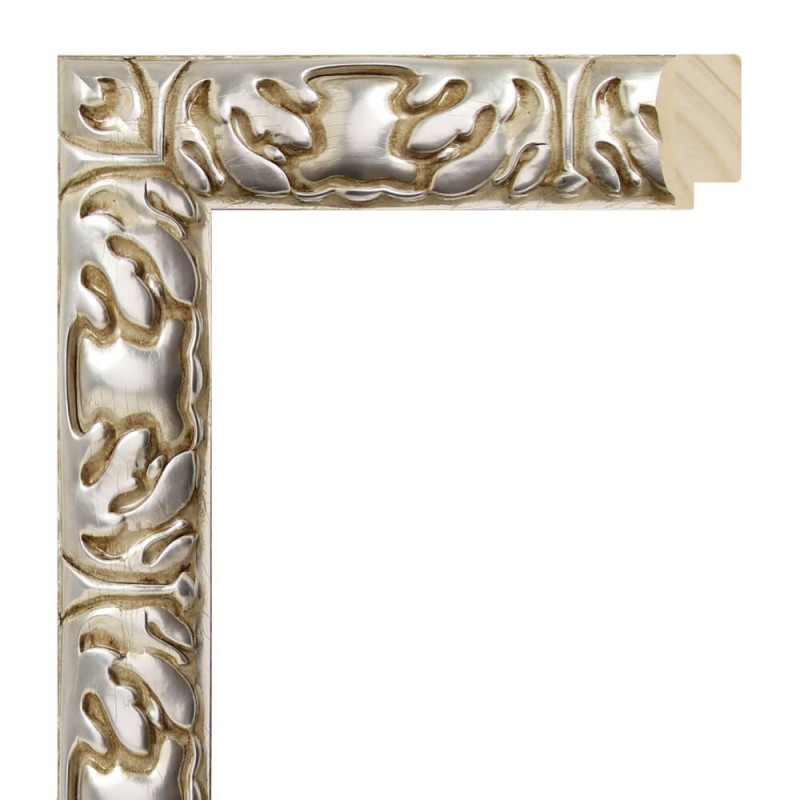 Moldura gravada em madeira de pinho. Decorado em cor prata brilhante envelhecida. Adequado para emoldurar imagens decorativas, fotografias, ilustrações, etc.