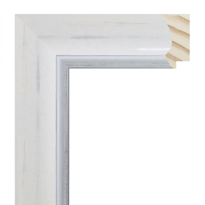 Moldura lisa feita de madeira de pinho. Decorado em cor branco com pinceladas de prata e bordo em prata. Adequado para emoldurar imagens decorativas, fotografias, ilustrações, etc.